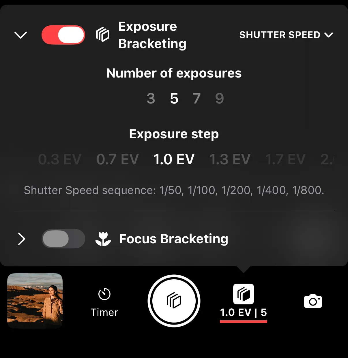 Before shooting, the app displays the planned exposure sequence so you can verify the values. The current exposure value is always in the middle of the sequence. Half of the photos will be darker and half will be brighter than the current exposure.