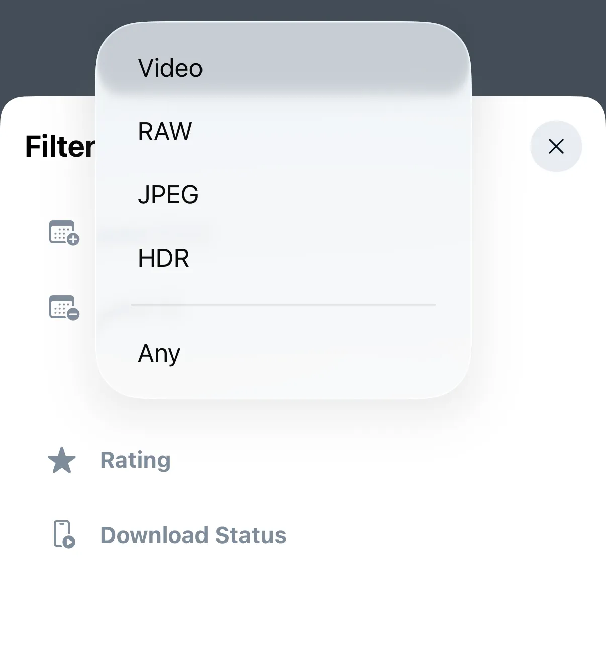| Kind / File type | Photo, RAW, JPEG, HDR (HEIF), or Video |