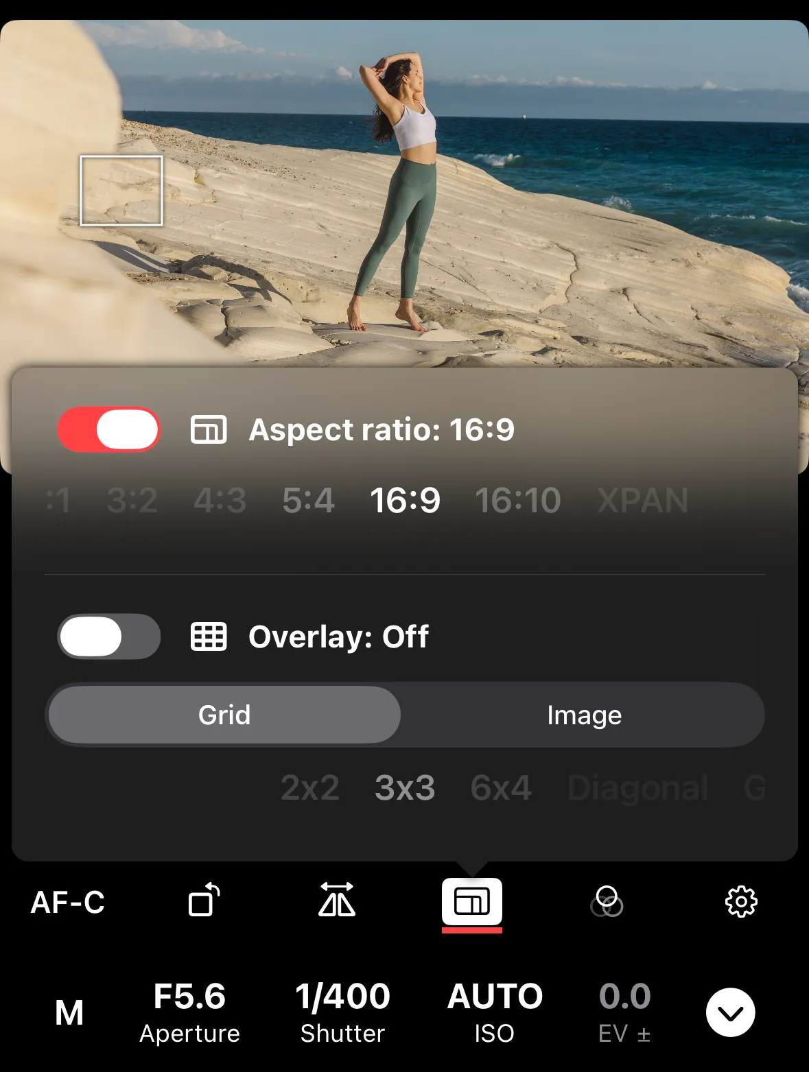 Open composition tools (nested rectangles icon) from the controls row and select your desired aspect ratio. Enable and hide the aspect ratio overlay by tapping the on/off toggle before the “Aspect Ratio” header.
