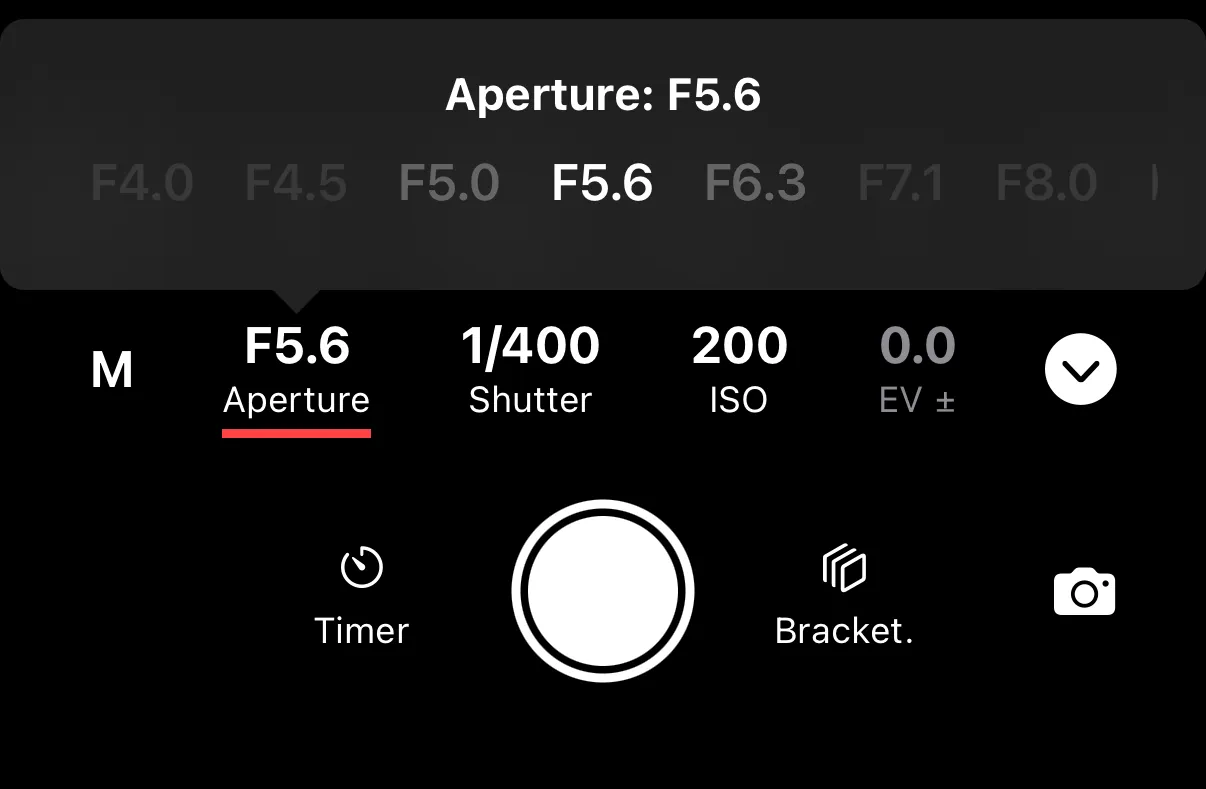 The range of available f-stops depends on the lens attached to your camera. A fast prime lens might go as wide as f/1.2, while a kit zoom lens might start at f/3.5.