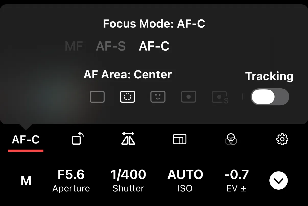 Some cameras also have a physical AF/MF switch on the lens or body. The app reflects whichever mode is currently active.