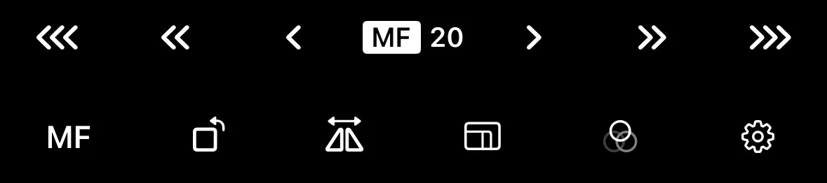 Use the on-screen focus controls to move the focus point nearer or farther. Buttons on the left move focus closer to the camera and buttons on the right move it further. Three speed options are available:
